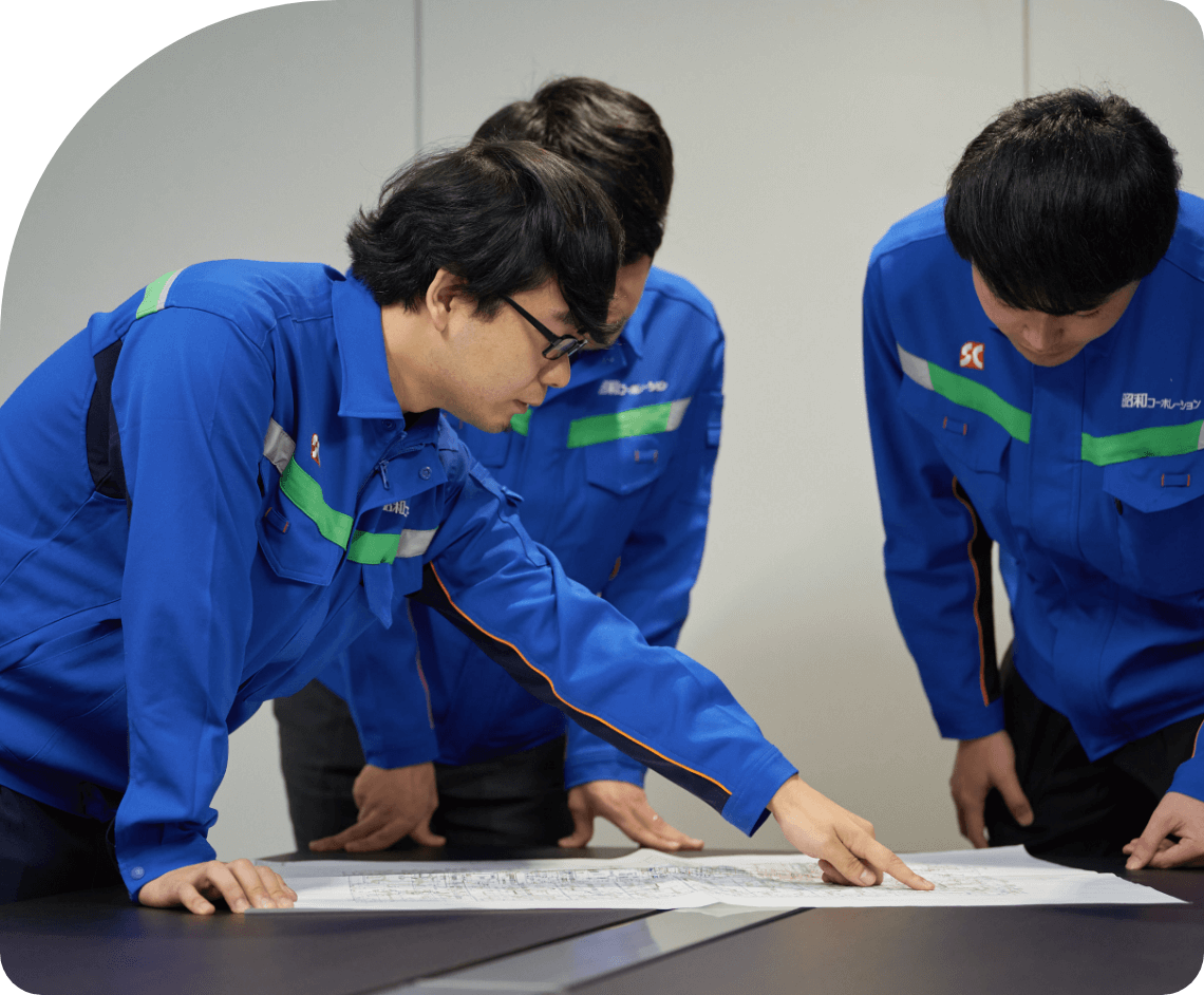 昭和コーポレーションの働く環境は、チームワークと自主性を大切にしています。上司や先輩との距離が近く、困ったときにはすぐに相談できるので、安心して仕事に取り組むことができます。また、社員一人ひとりの意見やアイデアを尊重し、共に成長できる職場です。新しい技術やアイデアを積極的に取り入れ、常に挑戦を楽しむことができる環境が整っています。